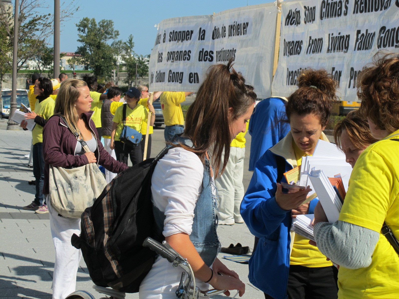 法轮功学员在市政厅入口处设立真相点,民众了解真相