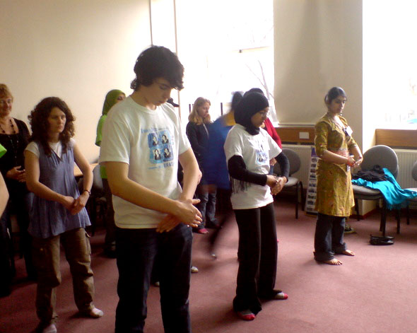 英国法轮功学员应邀参加布拉德福德大学和平教育活动 图为学生们认真的学习法轮功功法2007-3-4