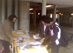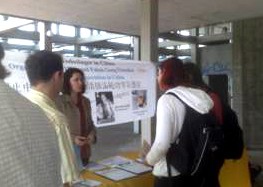法轮功学员在西班牙萨拉戈萨市的一所公立学校介绍法轮大法,图为法轮功真相展板 2008-4