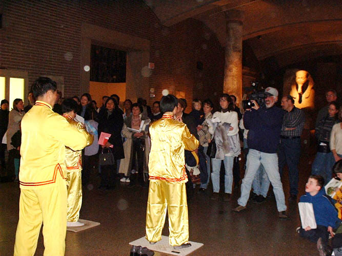胡访美取消,耶鲁校园酷刑展继续图为学员在耶鲁大学校园内炼功