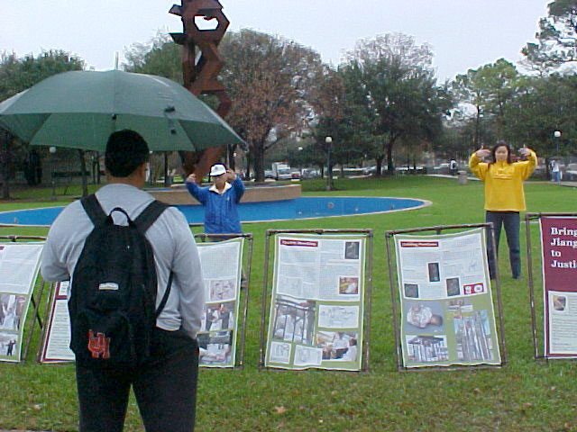 法轮功学员于休斯敦大学雨中举行反酷刑展