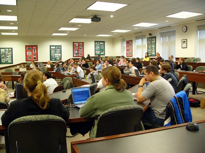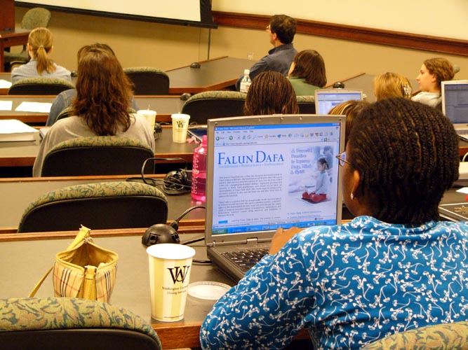 在华盛顿大学课堂上揭露迫害 教授、学生受震撼 图为学生当即到法轮功网站上浏览