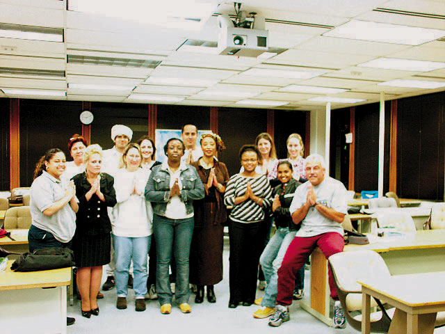 佛州法轮功学员在布劳沃德郡学院Mary Mckinney女士的宗教课上举办法轮功讲座,图为Mckinney女士(右起六)和部份学生
