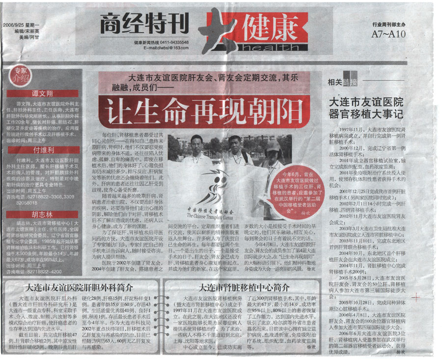 大连《商经特刊》2006年9月25日报道:大连市友谊医院不断扩大肾脏移植手术
