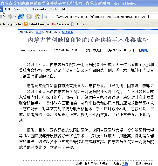 调查线索:石家庄市第一医院10小时内完成5例肾移植手术 2006-7-17