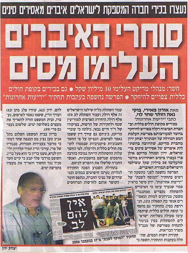 二零零七年八月,以色列主要报纸Yediot Achronot报导了该国四名男子涉嫌中介器官买卖,而器官来源包括中国大陆法轮功修炼者