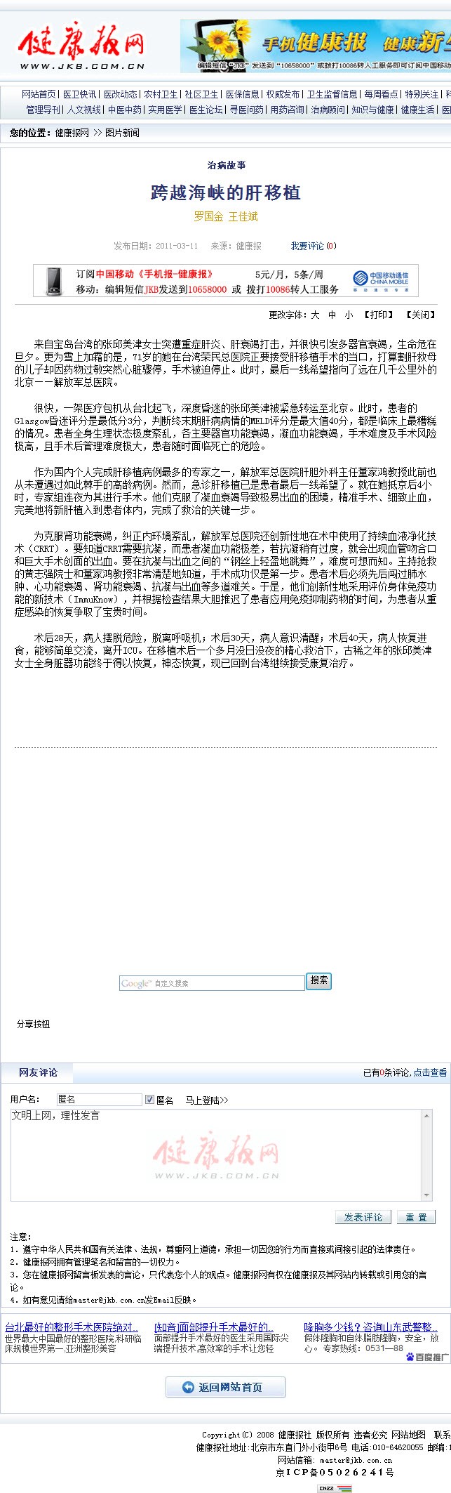 “跨越海峡的肝移植”,两天内肝源哪里来?图为《健康报》网:《跨越海峡的肝移植》