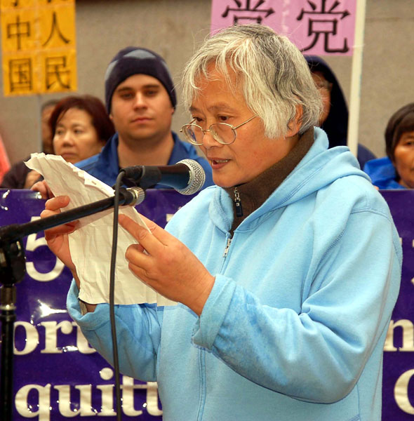 墨尔本民众举行声援一千七百万勇士退出中共的集会 图为刚逃离大陆的法轮功学员孙莲芝女士发言揭露中共的迫害2006-1-13