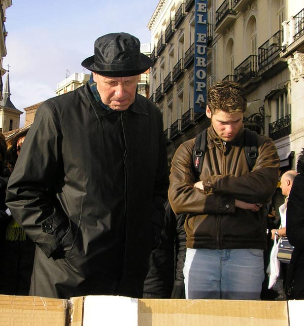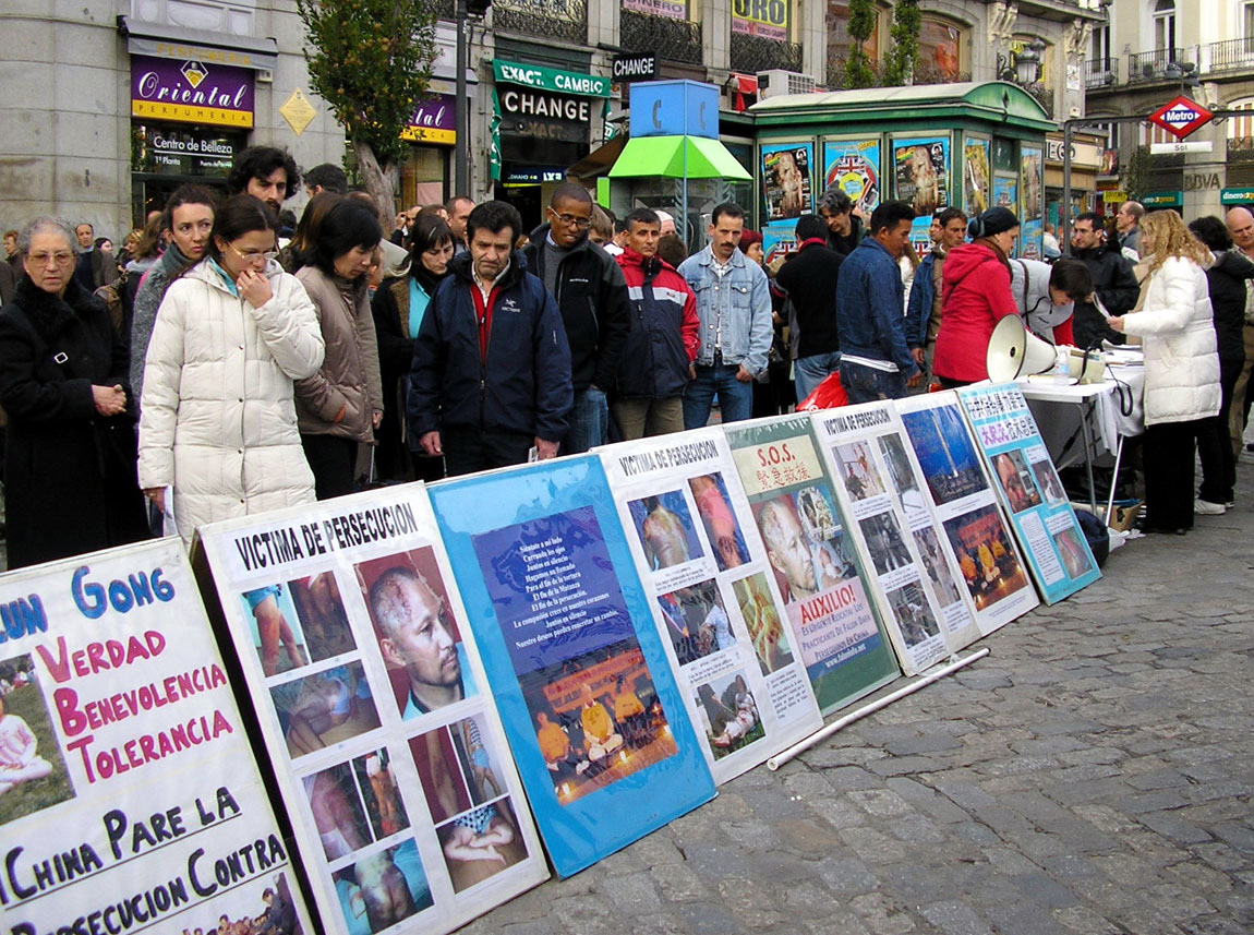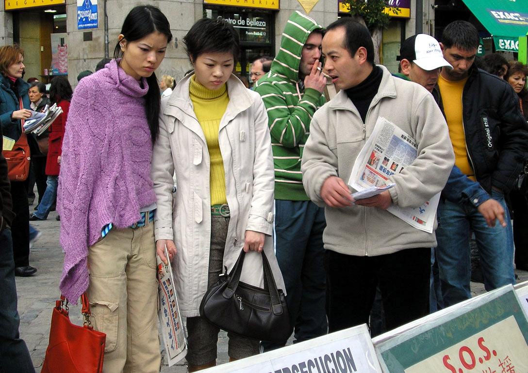 西班牙马德里民众在太阳门广场谴责中共暴行 声援1000万退出中共 图为人们被中共暴行所震惊 2006-4-21