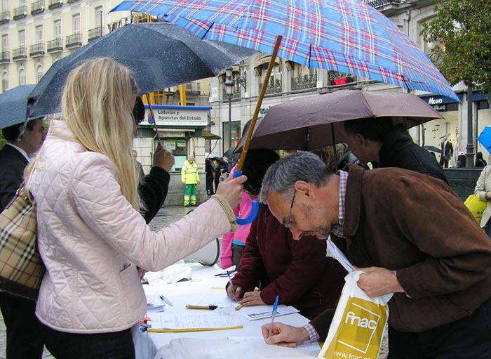 西班牙马德里民众在太阳门广场谴责中共暴行 图为人们签名声援1000万退出中共 2006-4-21