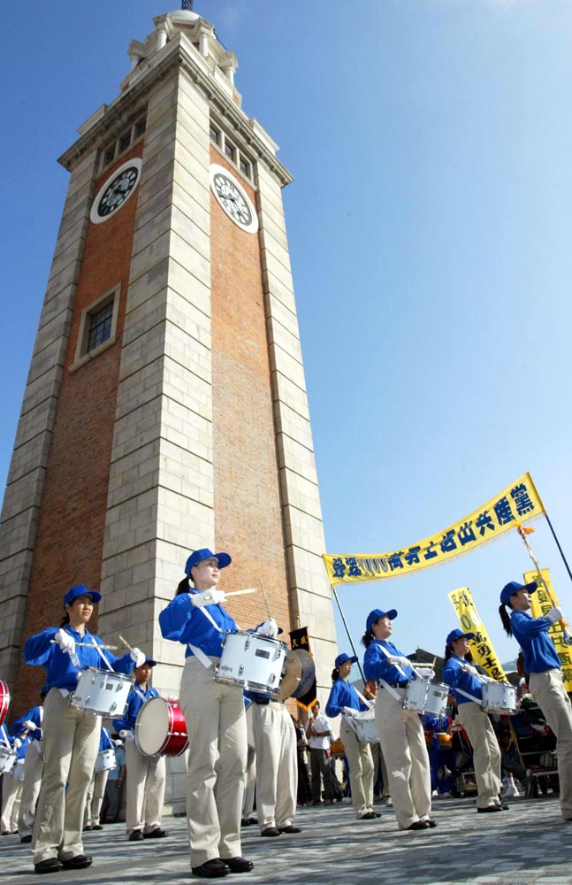香港各界民众在九龙举行的“全民觉醒 解体中共”大游行,图为由法轮功学员组成的天国乐团在尖沙咀钟楼前表演 2006-4-30