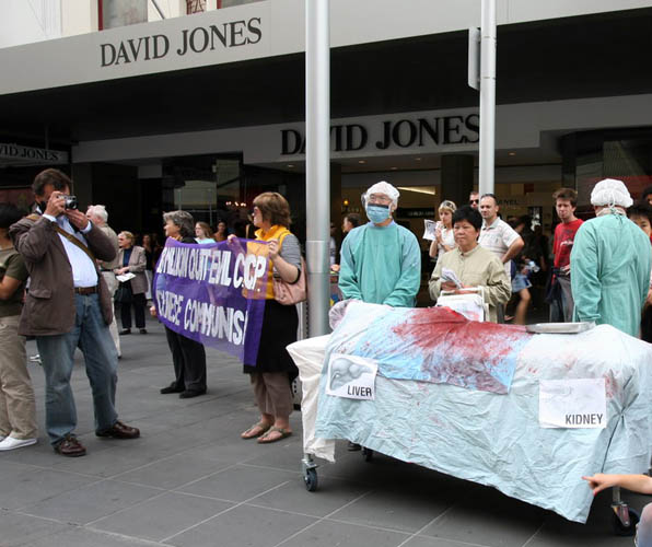墨尔本民众游行声援一千八百万勇士告别中共 图为揭露中共活摘法轮功学员器官的模拟演示2007-2-10