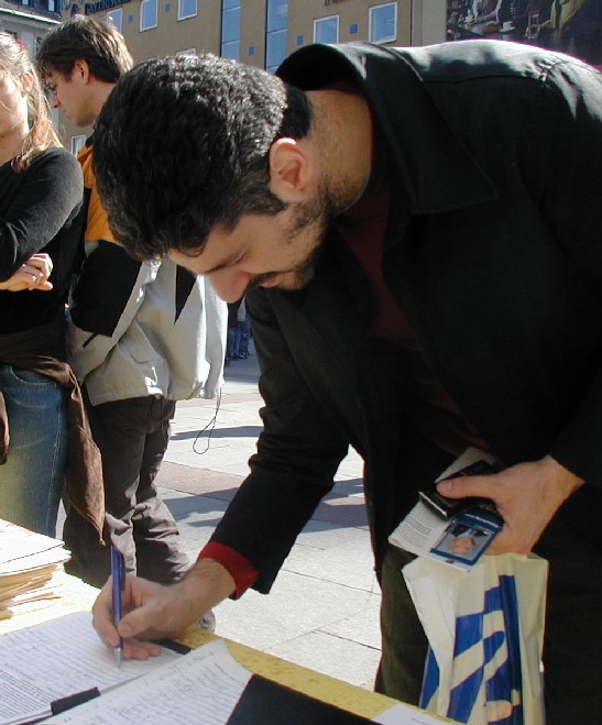 法轮功学员在慕尼黑声援两千万退出中共大潮图为来自希腊民众签名谴责中共暴行
