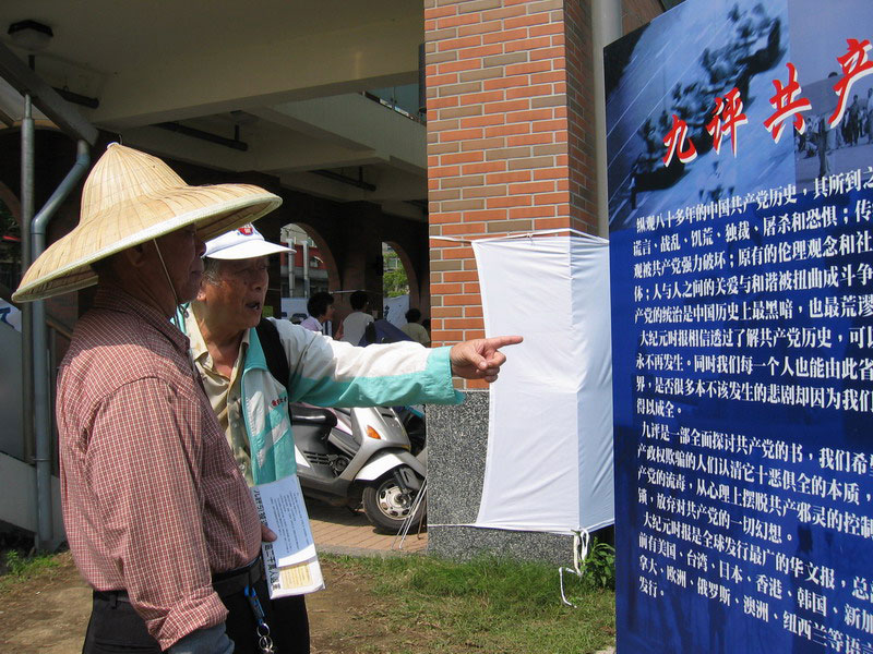 台湾声援二千万勇士退出中共图为民众李老先生解说九评展板的简体字内容2007-4-15