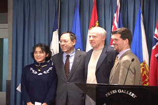 加拿大学员举办新闻发布会呼吁营救在大陆被非法抓捕的法轮功学员马剑 图中右二为马剑的妻子2007-3-24