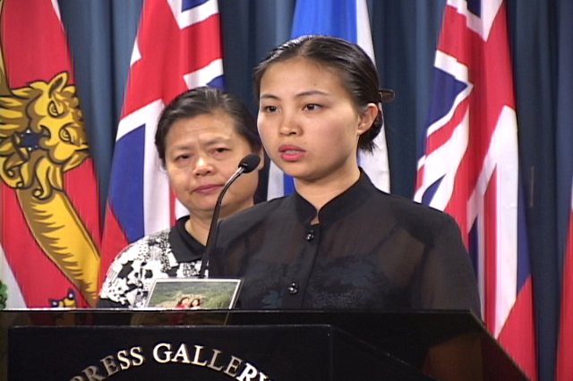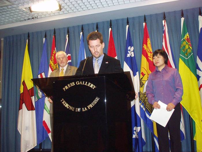 加拿大国会议员(左)出席新闻发布会,支持陈英毅(右)以及法轮功学员的呼吁,要求中国政府释放陈英毅的妹妹。