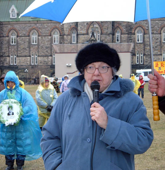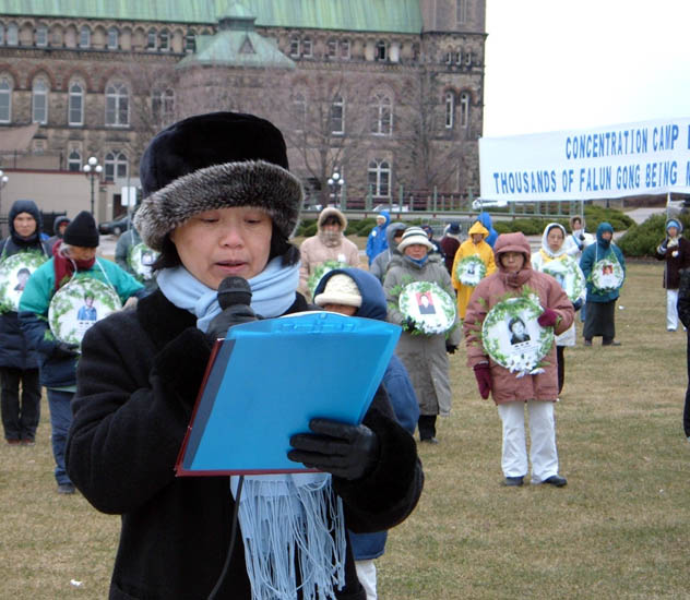 加拿大学员在国会山庄前悼念被迫害致死的法轮功学员,图为:沈阳的朱女士发言06-4-3