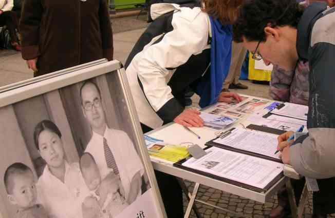 胡锦涛访德前夕 法轮功学员柏林举办反酷刑展请愿 图为呼吁营救半年前从德国回中国受到迫害的姜仁政一家