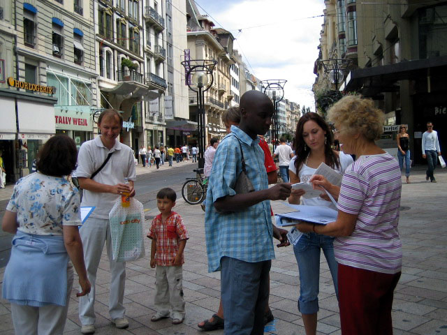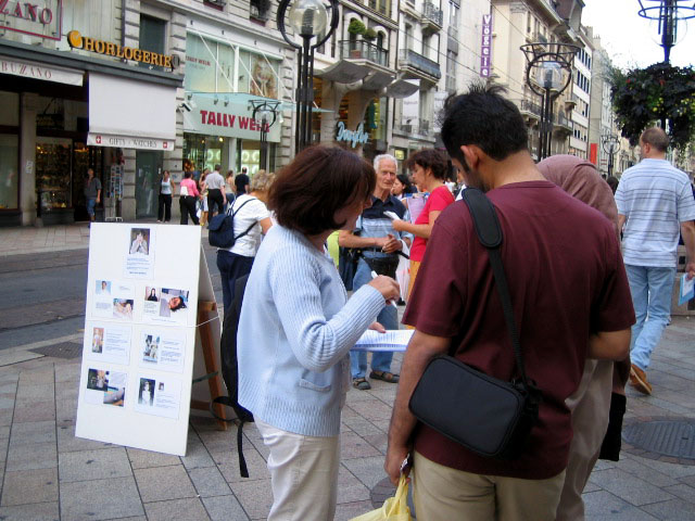 瑞士法轮功学员在街头征集支持签名营救在中国被迫害的法轮功学员