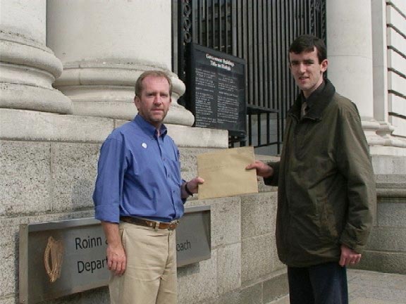Published on 4/12/2003 爱尔兰大法协会和国际特赦向爱尔兰外交部递交民众签署的大批明信片和签名 支持营救留学生刘峰杨芳(图)