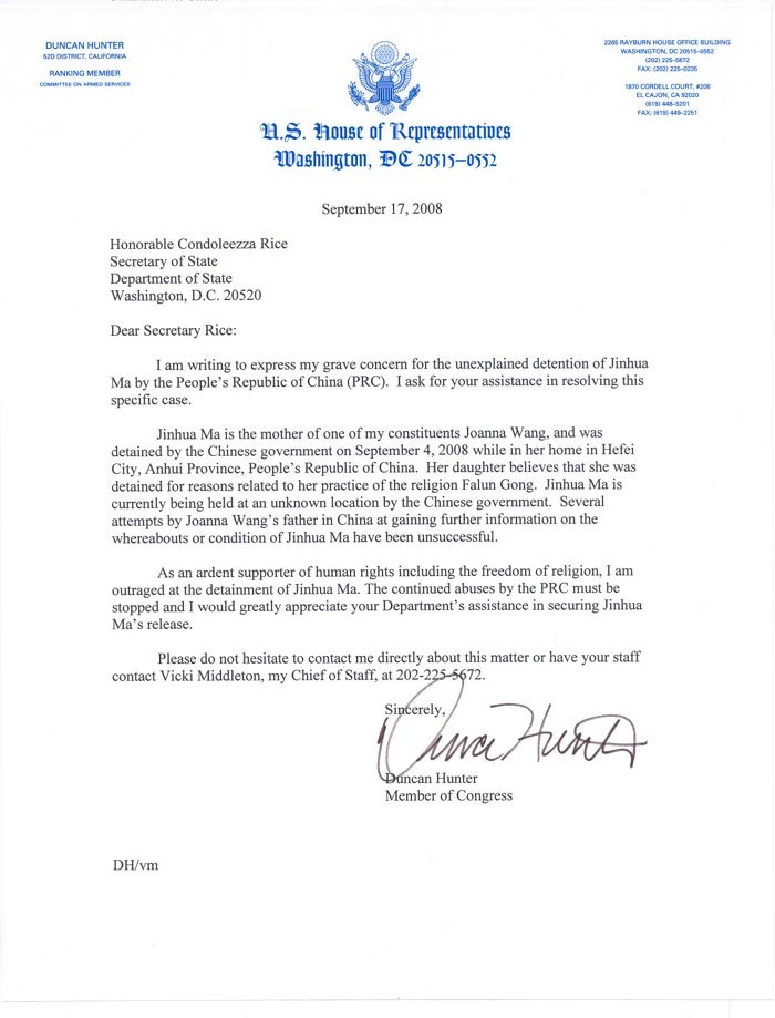 美国会议员Duncan Hunter致信国务卿 营救法轮功学员
