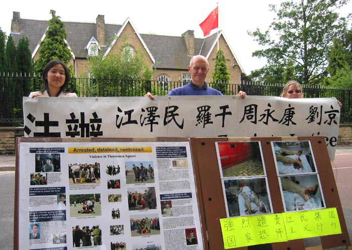 英国曼城法轮功学员中领馆前抗议江氏集团雇凶杀人