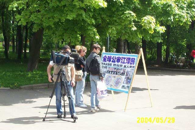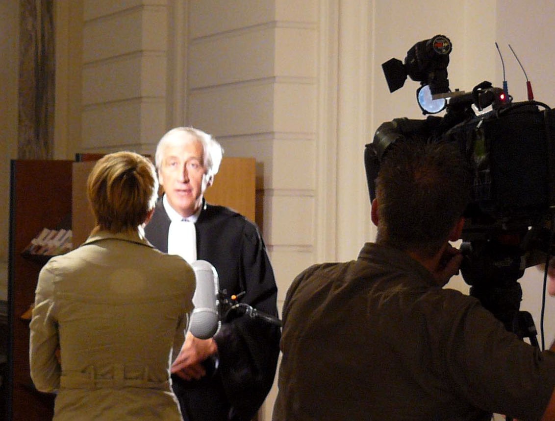 法轮功学员在荷兰起诉前中国主席江XX、商务部长薄熙来以及610头目李岚清 图为荷兰国家广播电台采访诉江案律师