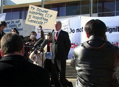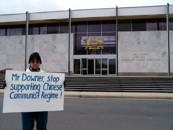 澳洲法院聆讯开庭薄熙来案原告将申请缺席判决图为学员在法庭外支持控告薄熙来2007-10-8