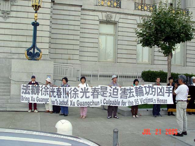旧金山学员举行新闻发布会向各界通告北京官员刘淇参与迫害法轮功被判有罪 图为在发布会上法轮功学员呼吁释放正在受到迫害的美国公民李祥春