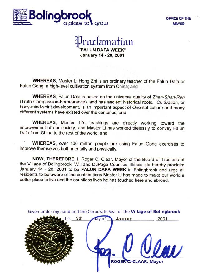 美国伊利诺伊州保龄布鲁克市宣布“法轮大法周”