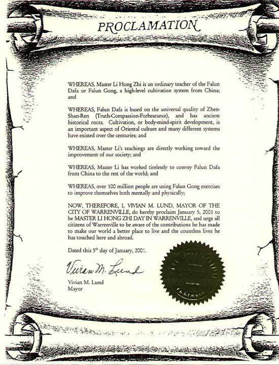 美国伊利诺伊州沃伦维尔市宣布“李洪志大师日”