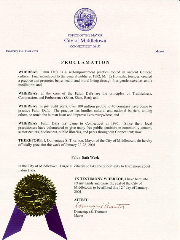 康涅狄格州中镇市宣布“法轮大法周”