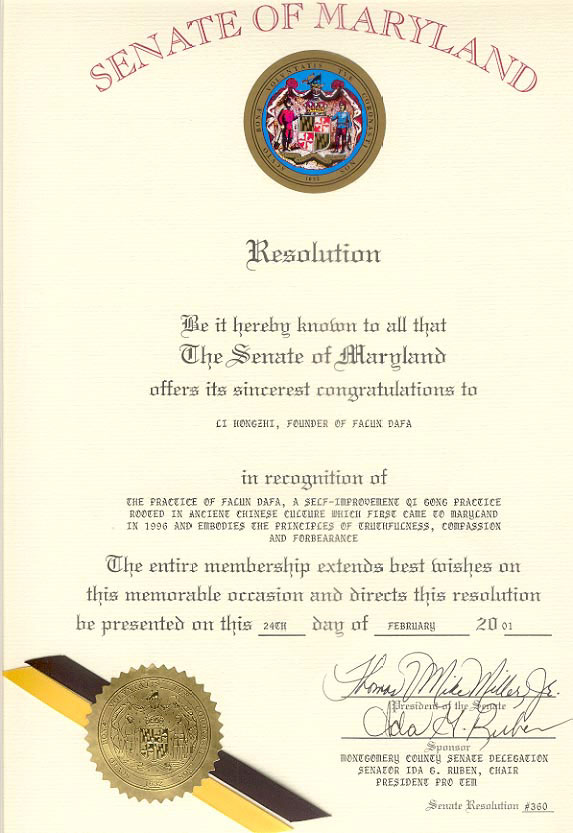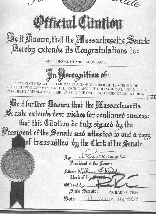 马萨诸塞州参议院褒奖李洪志先生和法轮大法