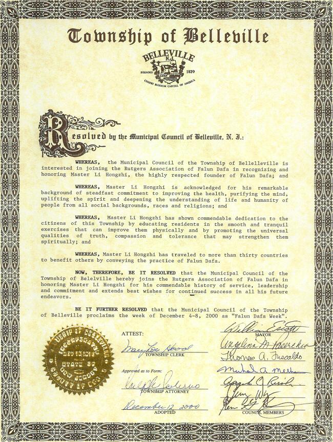 新泽西州坡斯安波益市市长宣布2000年12月4-10日为该市“法轮大法周”并表彰李洪志先生的教导