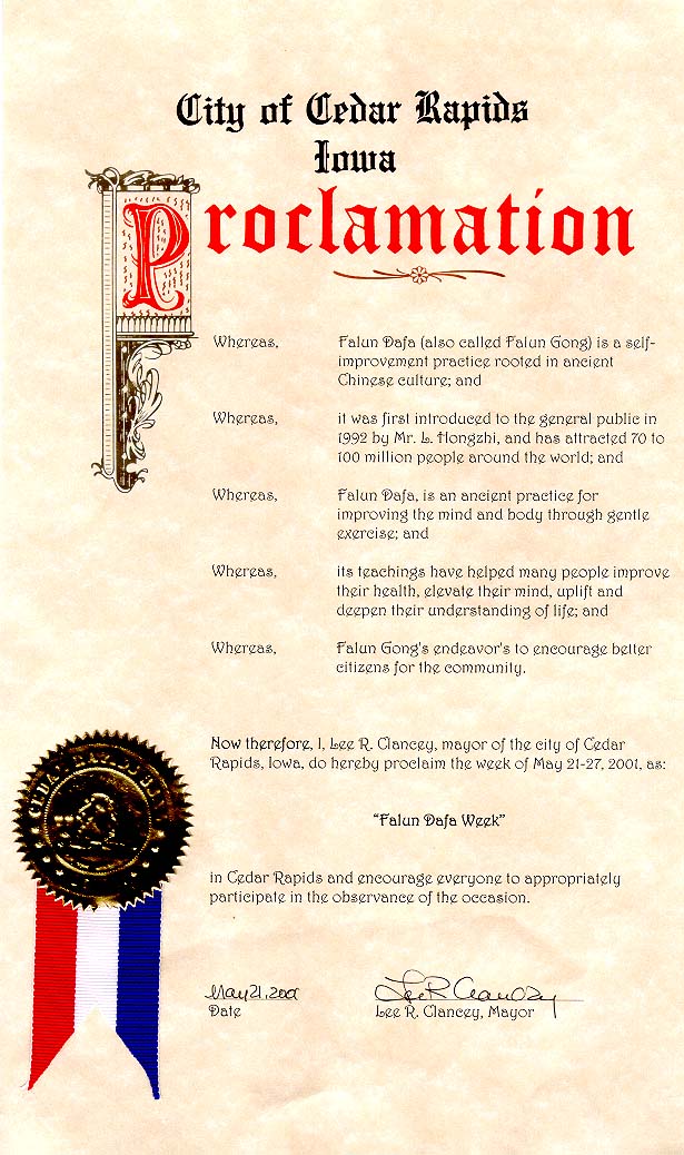 美国爱荷华州州长宣布2003年5月为“法轮大法月”