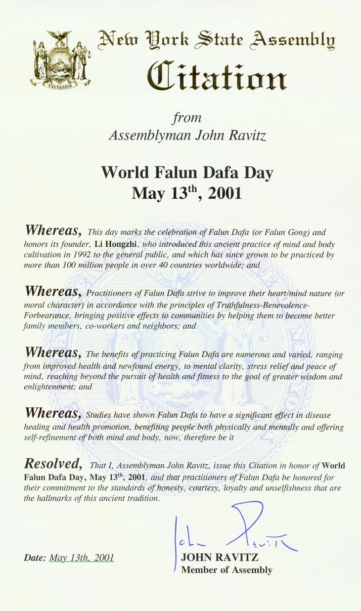 纽约州众议员褒奖李洪志大师