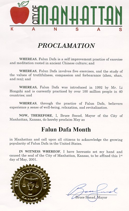 密苏里州堪萨斯市市长褒奖5月13日- 20日为法轮大法周
