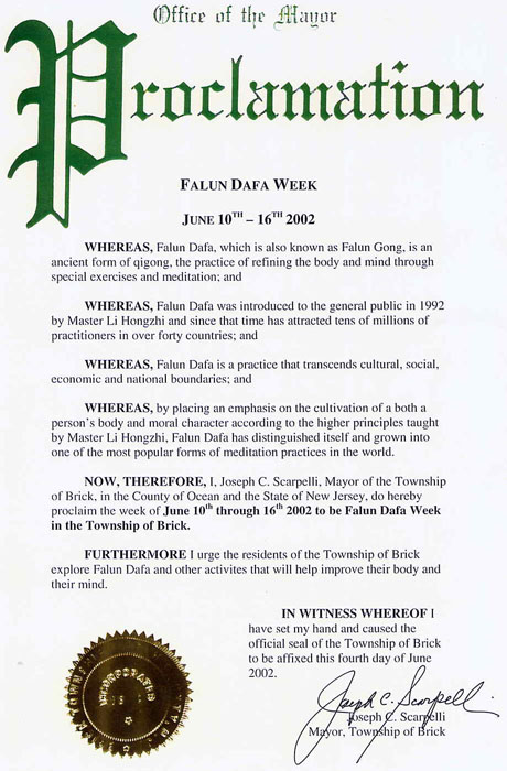 新泽西州东桔市市长发布公告,嘉奖李洪志大师