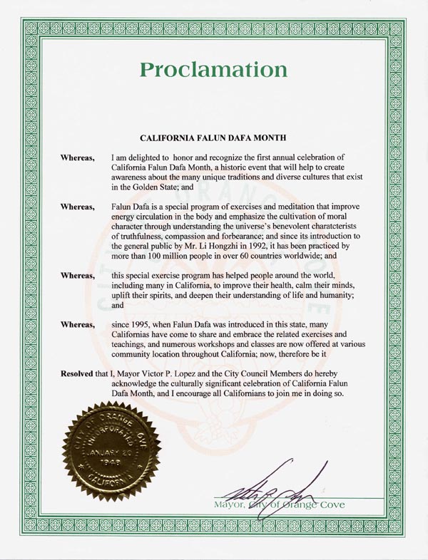 加州橙考夫市市长褒奖加利福尼亚州法轮大法月