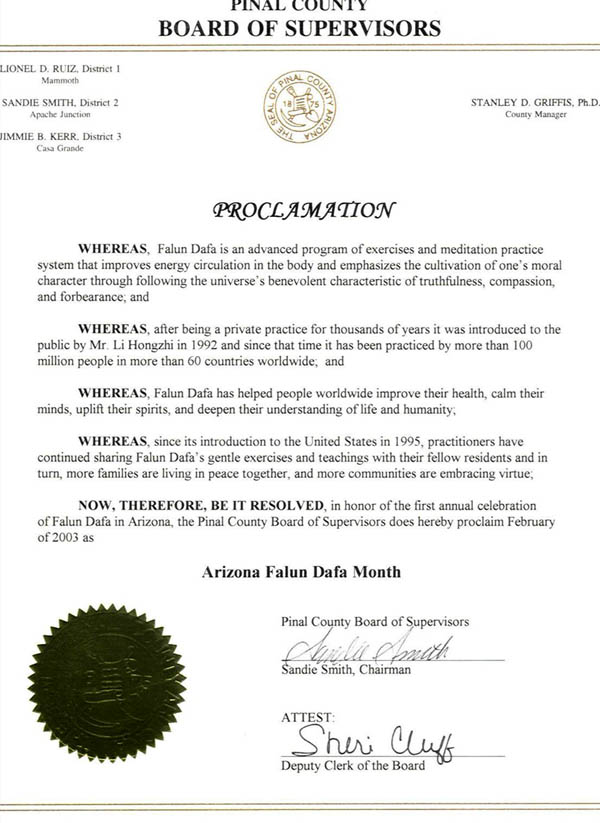 亚利桑那州槟诺尔县监事会褒奖公告