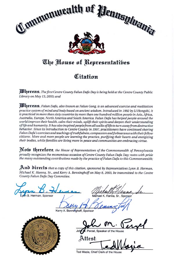 美国宾夕法尼亚州众议院褒奖法轮大法所做的杰出贡献 2003-7-5