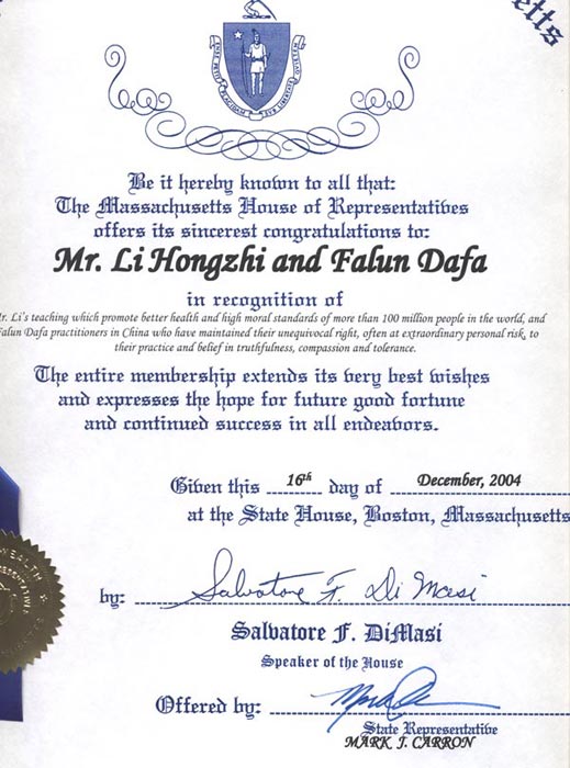 马萨诸塞州众议院议长褒奖李洪志先生和法轮大法