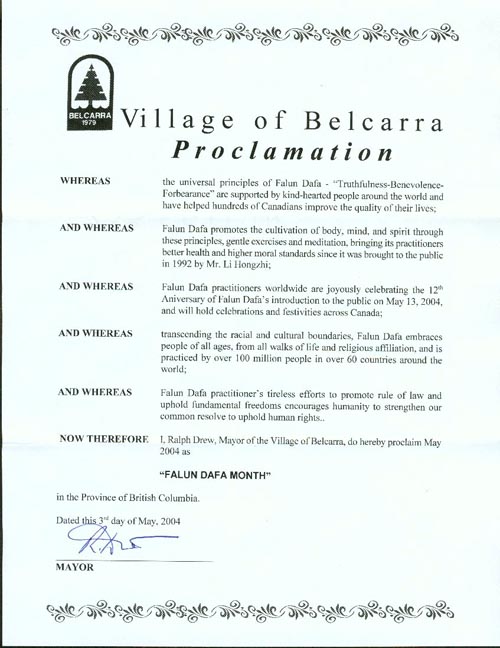 加拿大不列颠哥伦比亚省贝尔卡拉镇褒奖“法轮大法月”