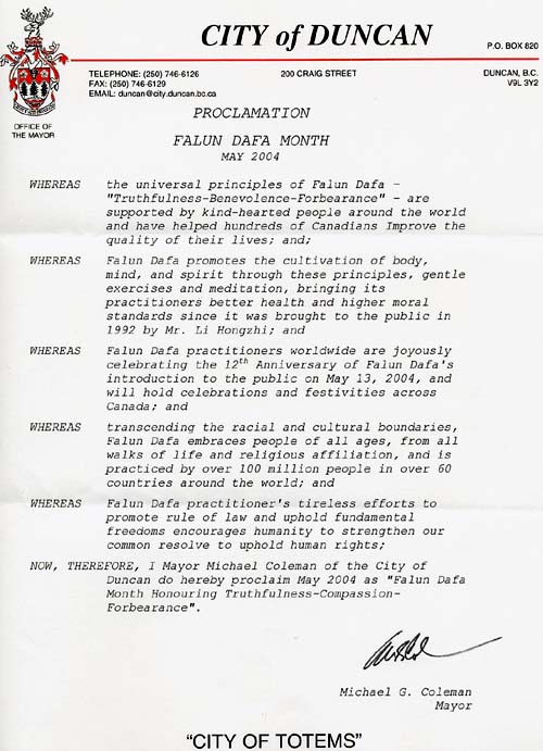 加拿大不列颠哥伦比亚省邓肯市褒奖“法轮大法月”