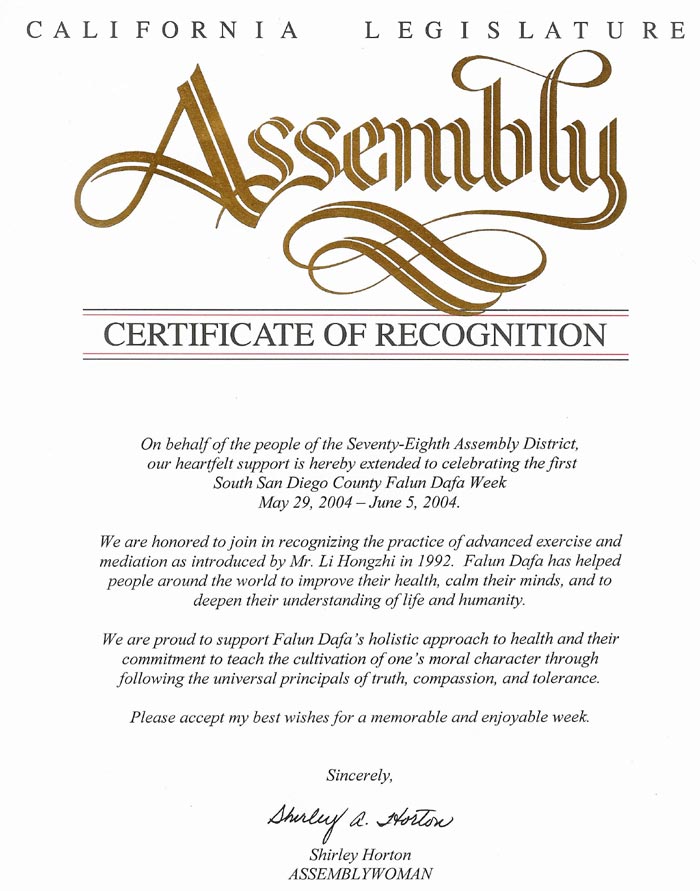 加州第78选区议员颁发证书褒奖南圣地亚哥郡法轮大法周