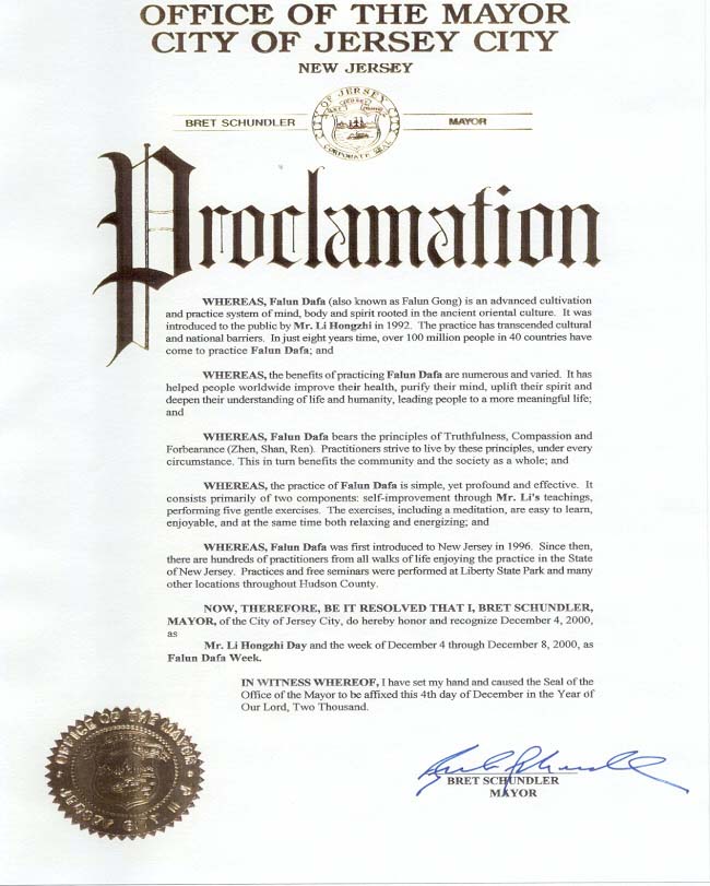 新泽西州泽西市市长宣布“李洪志先生日”和“法轮大法周”