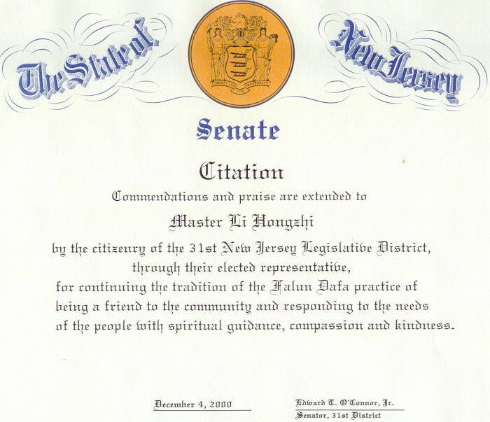 新泽西州33选区参议员为李洪志大师颁发嘉奖令