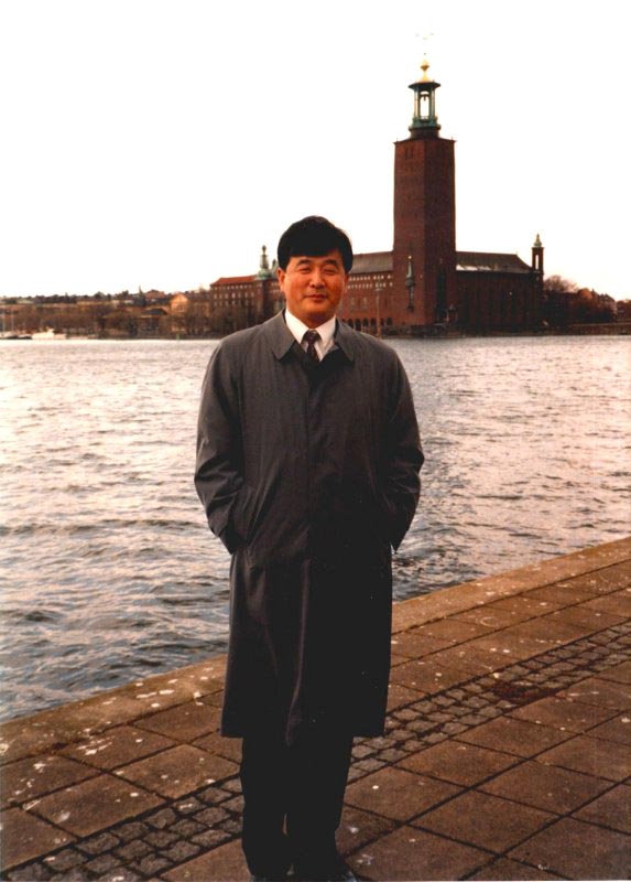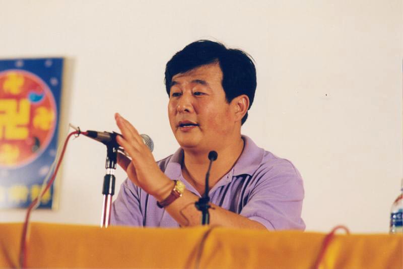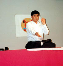 新加坡大法弟子忆九六年参加北京国际法会图为师尊为了让后面的学员能看的见高坐在桌子上讲法