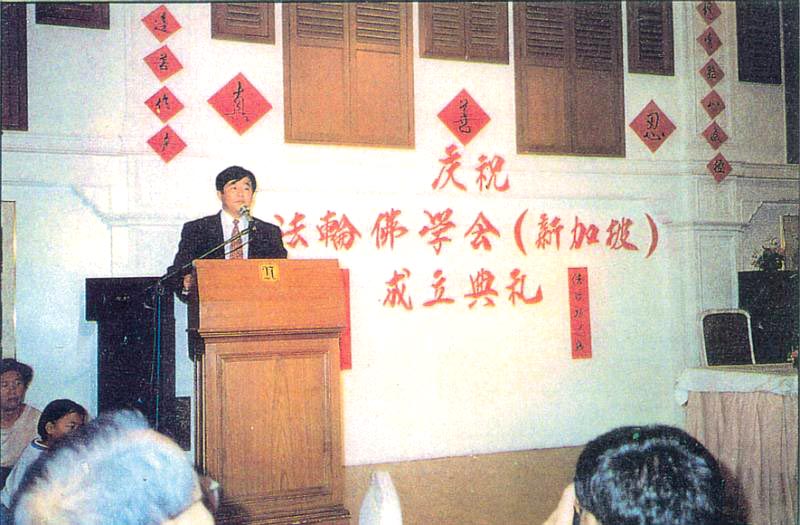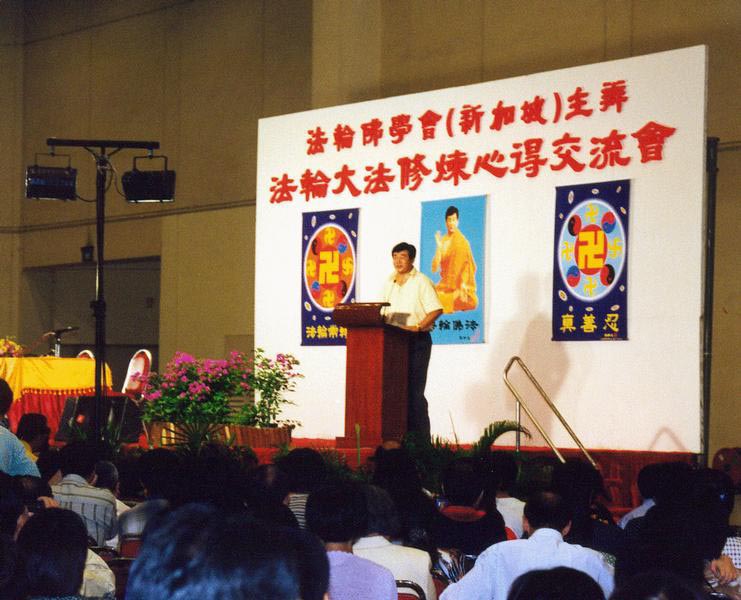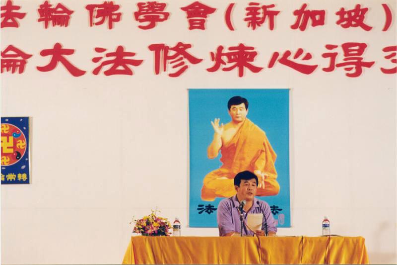 师父在一九九八年新加坡国际法会上讲法,图为法会后师父让学员拍照