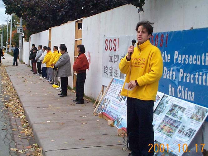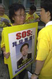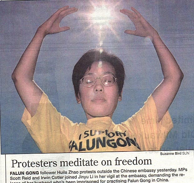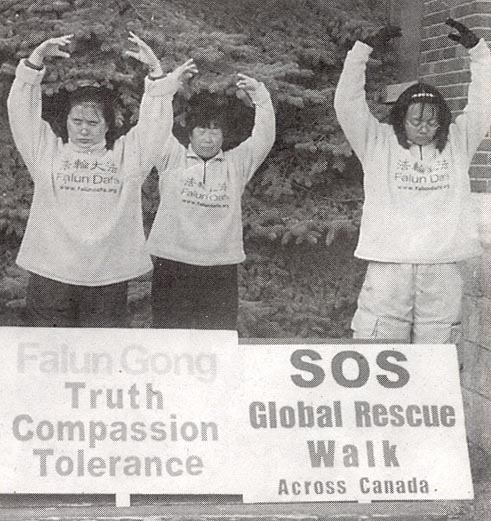 苹果日报10/2/00香港法轮学员会展练功抗议